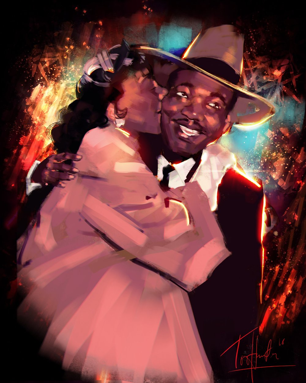 A Colorful retake of an iconic Black and White image of Rev Dr Martin Luther King Jr and his wife Coretta Scott King.